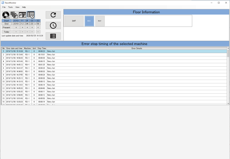 Details of errors and machine stops are displayed chronologically. By analyzing this history, improvements can be made to minimize the unplanned stop time and increase machine availability.